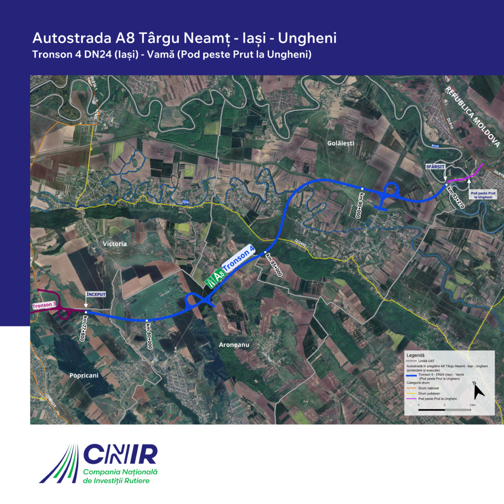 Compania Nationala de Investitii Rutiere (CNIR) a publicat in Sistemul Electronic pentru Achizitii Publice (SEAP) licitatia pentru supervizarea lucrarilor pe tronsonul 4 al Autostrazii Unirii Targu Neamt (Motca)-Iasi-Ungheni.